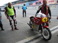Unten: Unser Instruktor Jürgen (im grünen Hemdchen) bewundert eine alte MV Agusta. Diese wurde aber nicht zugelassen, weil zu laut!